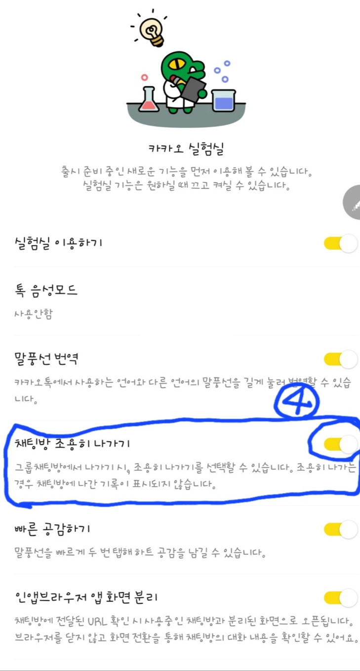 로 표시되고 끄게 되면 회색으로 표시됩니다) '채팅방 조용히 나가기'도 켭니다